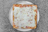 Thick crust square pizza with tomato sauce, mozzarella and basil